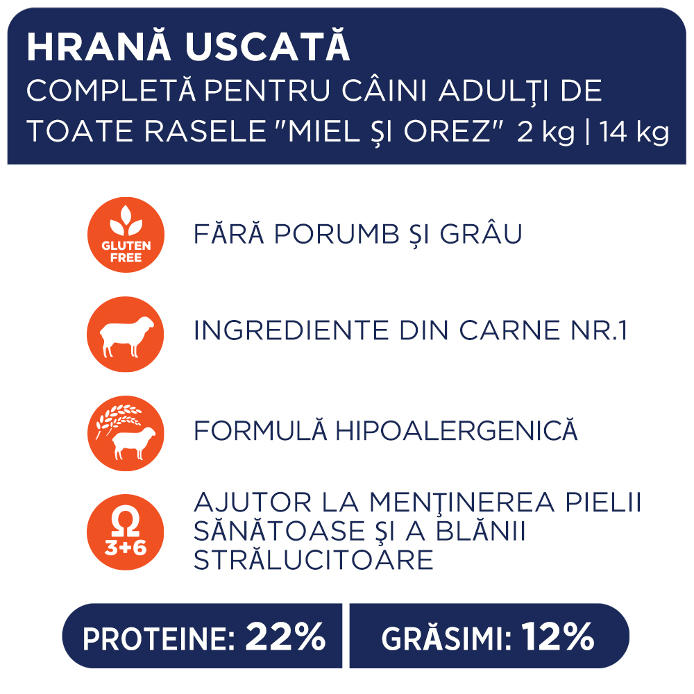 Hrana premium uscată echilibrata pentru caini adulti de toate rasele. Conține o formulă hipoalergenică pe bază de miel și orez, eliminând la maxim factorii care provoacă reacții alergice. Hrana nu contine porumb, grâu, coloranti și arome artificiale și, prin urmare, este ideală pentru câinii de toate rasele de la vârsta de 1 an cu predispoziție la alergii. Hrana este îmbogățită cu Omega 3 + Omega 6 pentru o piele sănătoasă și blana strălucitoare, precum și INTEGRAMIX pentru susținerea generală a sănătății animalului dvs. de companie.