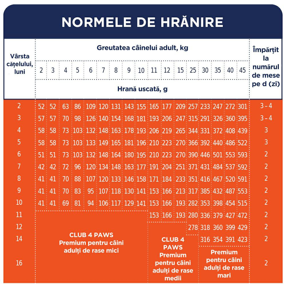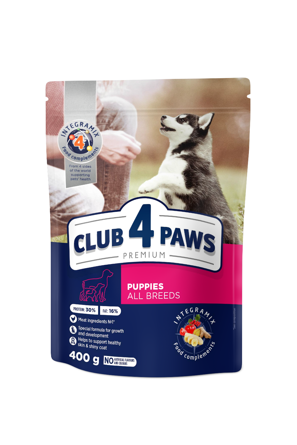 CLUB 4 PAWS PREMIUM PENTRU CĂȚEI DE TOATE RASELE ” CU CONȚINUT RIDICAT DE PUI”. HRANĂ USCATĂ COMPLETĂ.