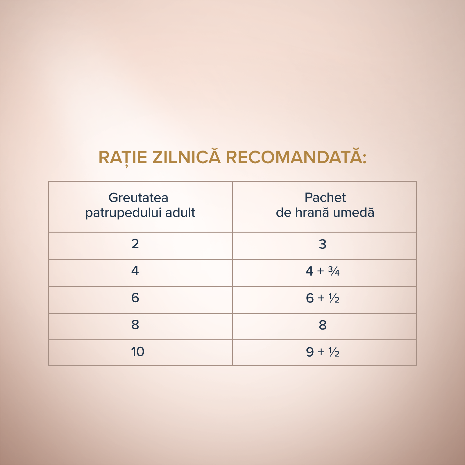 Perioada de valabilitate: 24 de luni de la data fabricației. A se păstra într-un loc uscat la o temperatură cuprinsă între + 6 °C și + 30 °C. După deschiderea ambalajului a se păstra în frigider nu mai mult de 48 de ore. Rația de hrană trebuie să fie consumată la temperatura camerei. Hrana trebuie introdusă treptat în alimentația animalelor (cel puțin în primele 5 zile). Oferiți animalului acces permanent la apă potabilă. Rațiile individuale de hrană pot varia în funcție de vârstă, rasă, nivel de activitate și habitat al animalului.