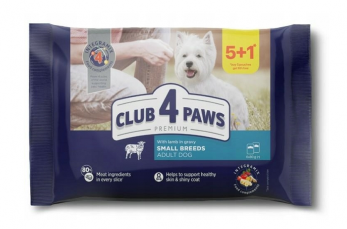 CLUB 4 PAWS PREMIUM "MIEL ÎN SOS". SET PLICURI HRANA UMEDA PENTRU CAINI ADULTI DE TALIE MICA, 6x85g