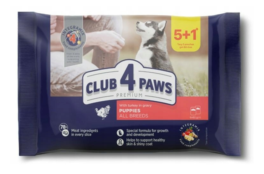 Hrana umeda Premium Club4Paws conține 78% carne și ingrediente din carne în fiecare bucata, plus o formulă specială de creștere cu un conținut ridicat de curcan (25%) pentru o dezvoltare sănătoasă în primele 12 luni de viață.
