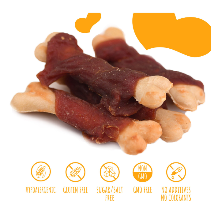 Compozitie: : Carne de rata 54,8%, os de calciu alb 34,5%, amidon de porumb 2,9%, proteine vegetale, glicerina.