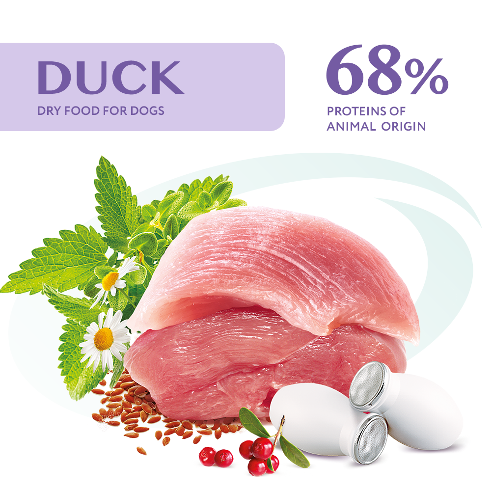 Compozitia: proteine deshidratate de raţă, cel puţin 22 %, orez, porumb, grăsime de pasare, gluten de porumb, carne dezosată de rață 5 %, proteine hidrolizate de origine animala 5 %, orez brun, ulei de somon, minerale, semințe de in 1,23 %, pulpă de sfeclă, drojdie de bere, răchiţele 0,2 %, ulei de peste de boraga, beta 1,3/1,6 glucani 0,05 %, Actigen ® (sursă prebiotic-manano- oligozaharide) 0,04 %, galbenele (sursă de luteina) 0,04 %, rădăcina de brustur, rădăcina de alteia, flori de muşeţel 0,03 %, urzică 0,03 %, extract de iucca, cimbru 0,015 %.