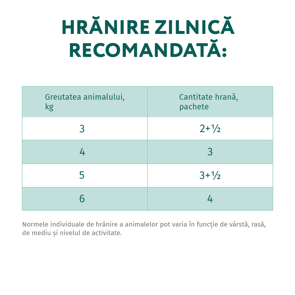 A se păstra într-un loc uscat la o temperatură cuprinsă între + 6 °C și + 30 °C. După deschiderea ambalajului a se păstra în frigider nu mai mult de 48 de ore. Hrană trebuie să fie consumată la temperatura camerei. Hrana trebuie introdusă treptat în alimentația animalelor (cel puțin în primele 5 zile). Asigurati animalului acces permanent la apă potabilă. Normele individuale de hrană pot varia în funcție de vârstă, rasă, nivel de activitate al animalului.