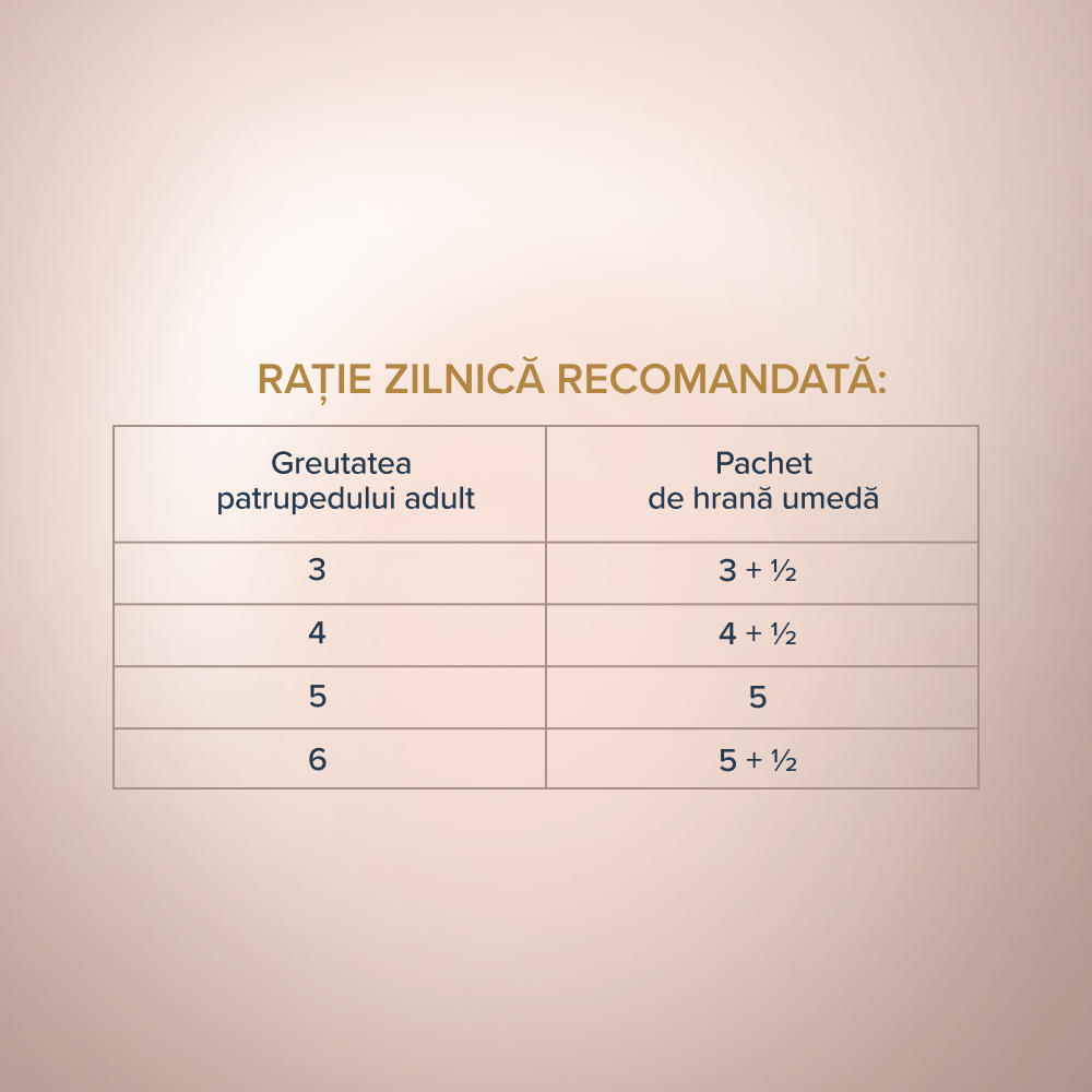 Perioada de valabilitate: 24 de luni de la data fabricației. A se păstra într-un loc uscat la o temperatură cuprinsă între + 6 °C și + 30 °C. După deschiderea ambalajului a se păstra în frigider nu mai mult de 48 de ore. Rația de hrană trebuie să fie consumată la temperatura camerei. Hrana trebuie introdusă treptat în alimentația animalelor (cel puțin în primele 5 zile). Oferiți animalului acces permanent la apă potabilă. Rațiile individuale de hrană pot varia în funcție de vârstă, rasă, nivel de activitate și habitat al animalului.