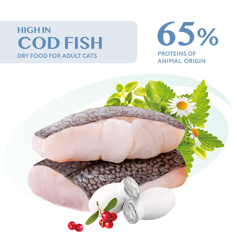 Compozitia: cod 14%, proteine de curcan deshidratate, cel puțin 11%, proteine de pui deshidratate, cel puțin 11%, orez, orz, porumb, proteine din porumb, grăsime de pui, minerale, proteine hidrolizate de origine animala 2,0%, ficat de pui uscat hidrolizat, semințe de in 1,7 %, drojdie de bere, pulpă de sfeclă, ulei de somon, proteină de pește hidrolizată 1%, praf de ou, afine 0,2%, ulei de peste boraga, beta-1,3 / 1,6 glucani 0,05%, Actigen® (sursă de prebiotice-mananoligozaharide) 0,04%, gălbenele ( sursă de luteină) 0,04%, rădăcină de brusture, rădăcină de alteia, flori de mușețel 0,03%, urzică 0,03%, cimbru 0,015%.