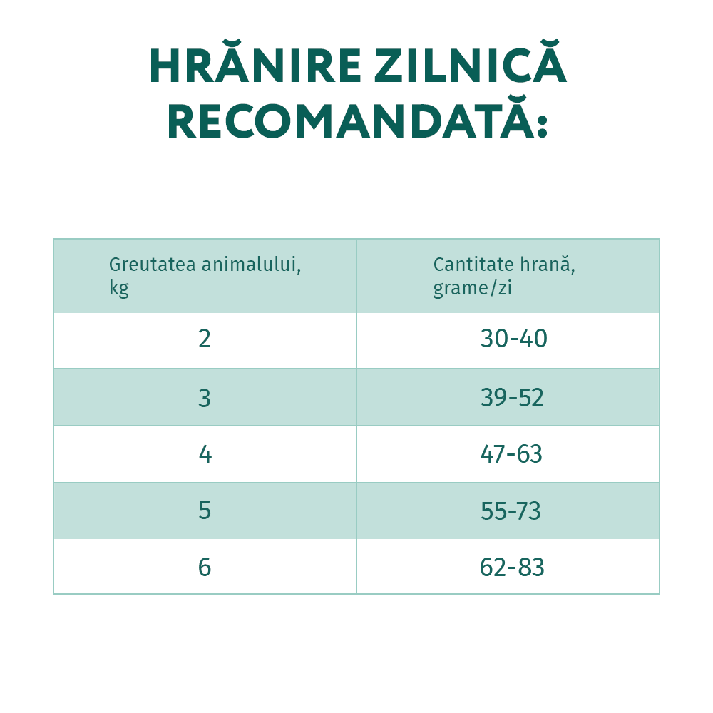 Aditivi (per 1 kg): acizi grași omega-3 - 7 g, acizi grași omega-6 - 37,95 g. 65,24% din proteinele hranei sunt de origine animală și de pește.