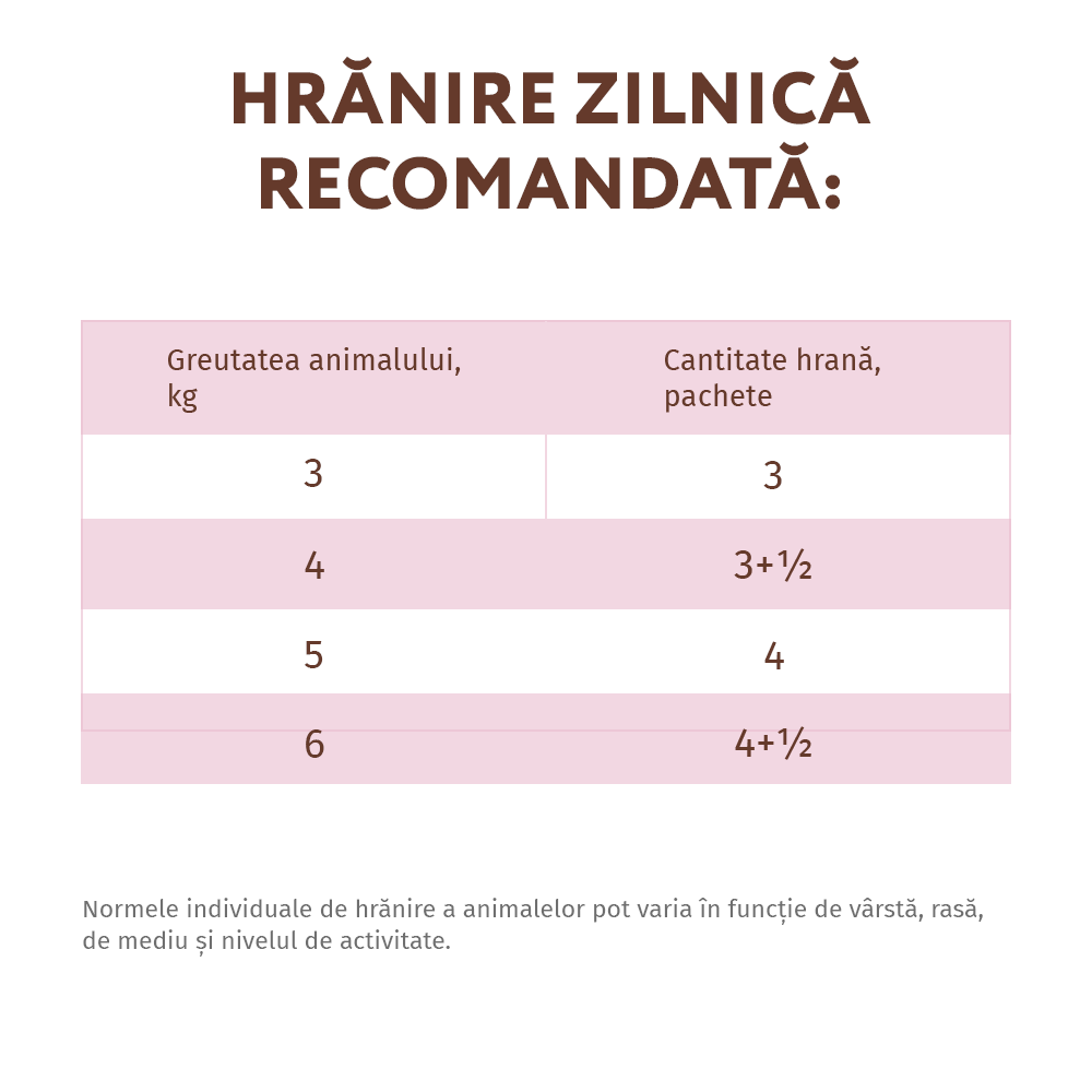 | Greutatea animalului, kg | Cantitate hrană, pachete |