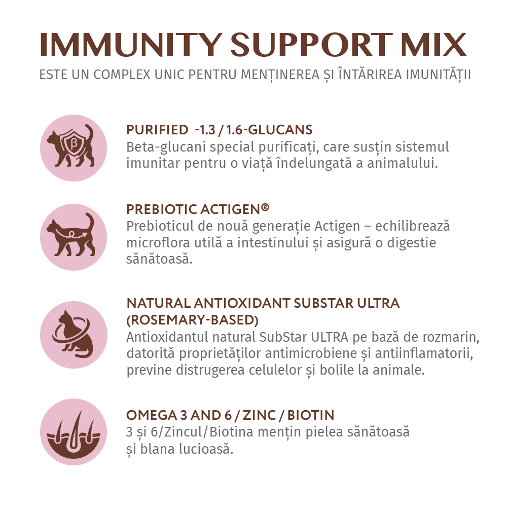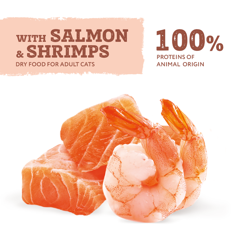 Componenţa: 83 % carne şi derivați de origine animală bucăţele în proporţie (între inima de vită cel puţin 18,8 %, de pui 14,7 %, și altele), moluşte şi crustacee (creveţi curăţaţi 12 %), peşte şi subproduse din peşte (bucăţele de somon 10 %), minerale, grăsimi şi uleiuri (untură de somon, ulei de limba mielului), zahăr, derivați de origine vegetale (răchiţele 0,05 %, vîzdoage (sursă de luteina) 0,01 %, rădăcina de brustur, rădăcina de althaea, flori de muşeţel 0,01 %, urzică 0,01 %, cimbru 0,01 %),Actigen ® (sursă prebiotic-manan oligozaharide) 0,01 %, beta 1,3/1,6 glucani 0,01 %. Constituenţi analitici: proteine – 11 %, grăsimi brute – 5,5 %, cenuşă brută – 1,5 %, celuloză brută – 0,3 %, umeditate – 80 %, calciu – 0,2 %, fosfor – 0,18 %,magneziu – 0,016 %. Per kg hrană: acizii graşi Omega-3- 1,4 g, acizii grași Omega-6 - 4,9 g. 99,54 % din proteinele furajere - de origine animală. Aditivi nutriționali (per kg hrană), mg/kg: vitamina D3 (3a671): 150 IU, vitamina E (3a700): 100, vitamina C (3a312): 40, D-pantotenat de calciu (3а841): 2,1, vitamina B1 (3а821): 1,79, acid folic (3а316): 0,49, vitamina B6 (3a831): 0,28, biotină (3a880): 0,04, taurină (3a370): 506,02, DL-metionină, tehnic pură (3с301):600, zinc (3b604): 2,1, mangan (3b503): 1,56, iod (3b201): 0,32, seleniu (3b801): 0,1 μg.
