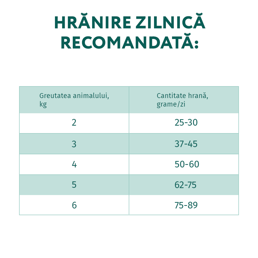Aditivi (per kg) hrana: acizi grași omega-3 5,4 g, acizi grași omega-6 29,5 g, 63,19% din proteinele hranei sunt de origine animală.