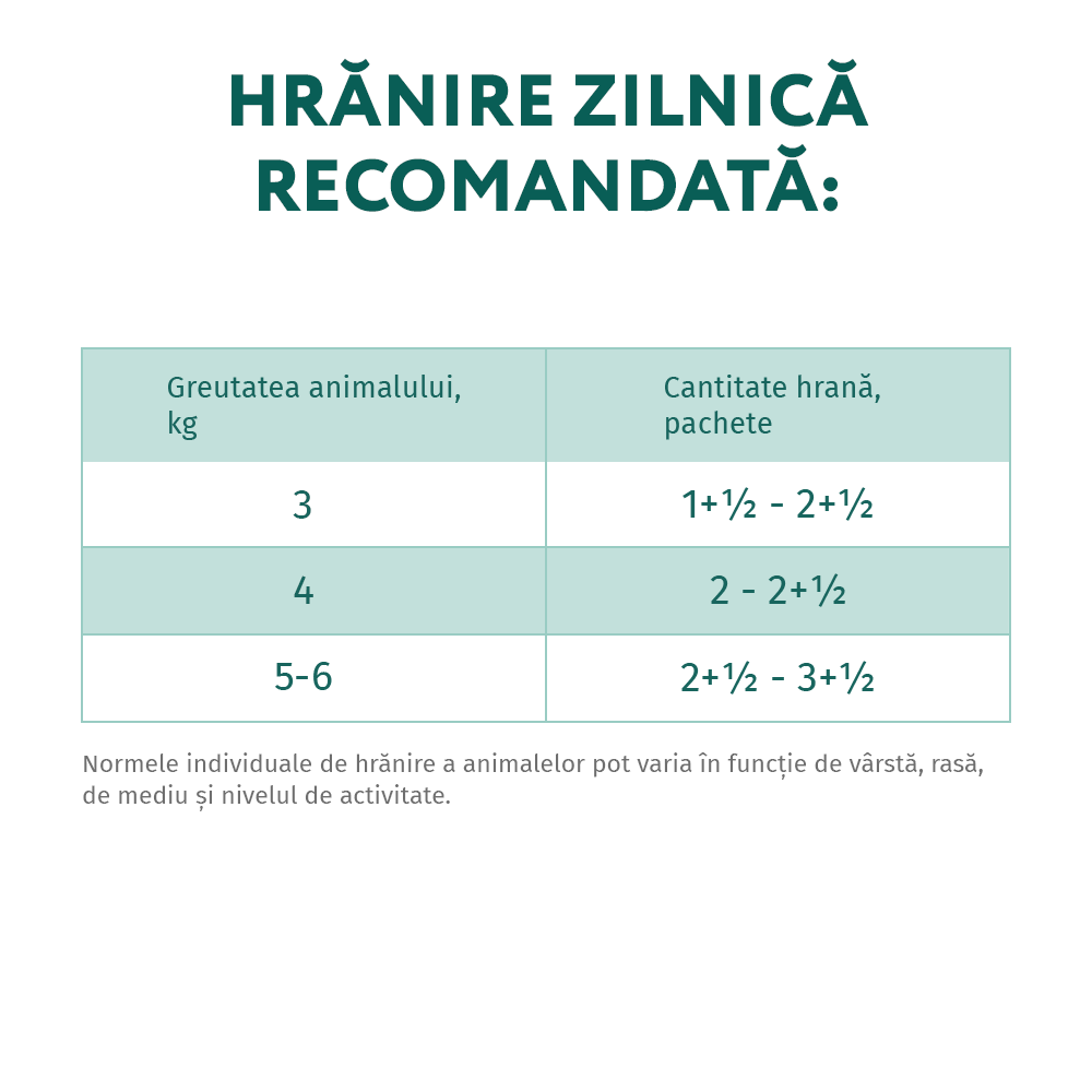 A se păstra într-un loc uscat la o temperatură cuprinsă între + 6 °C și + 30 °C. După deschiderea ambalajului a se păstra în frigider nu mai mult de 48 de ore. Hrană trebuie să fie consumată la temperatura camerei. Hrana trebuie introdusă treptat în alimentația animalelor (cel puțin în primele 5 zile). Asigurati animalului acces permanent la apă potabilă. Normele individuale de hrană pot varia în funcție de vârstă, rasă, nivel de activitate  al animalului.