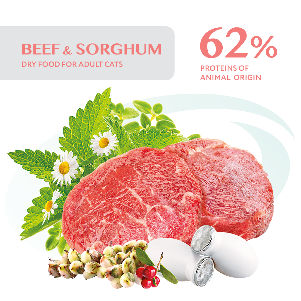 Compozitie: carne de vita dezosata 14%, proteine ​​de curcan deshidratate, cel putin 12%, proteine ​​de pui deshidratate, cel putin 12%, orez, proteine ​​din porumb, sorg cu cereale integrale 8%, porumb, grasime de pui, proteine ​​ hidrolizate de origine  3,5%, celuloza, pulpa de sfecla, minerale, seminte de in 1,9%, drojdie de bere, praf de ou, ficat de pui uscat hidrolizat, ulei de somon, afine 0,2%, ulei de peste boraga, beta-1,3 / 1,6 glucani 0,05%, Actigen® (sursa de prebiotice-manano-oligozaharide) 0,04% , galbenele (sursa de luteina) 0,04%, radacina de brusture, radacina de alteia, flori de musetel 0,03%, urzica 0,03%, cimbru 0,015%.