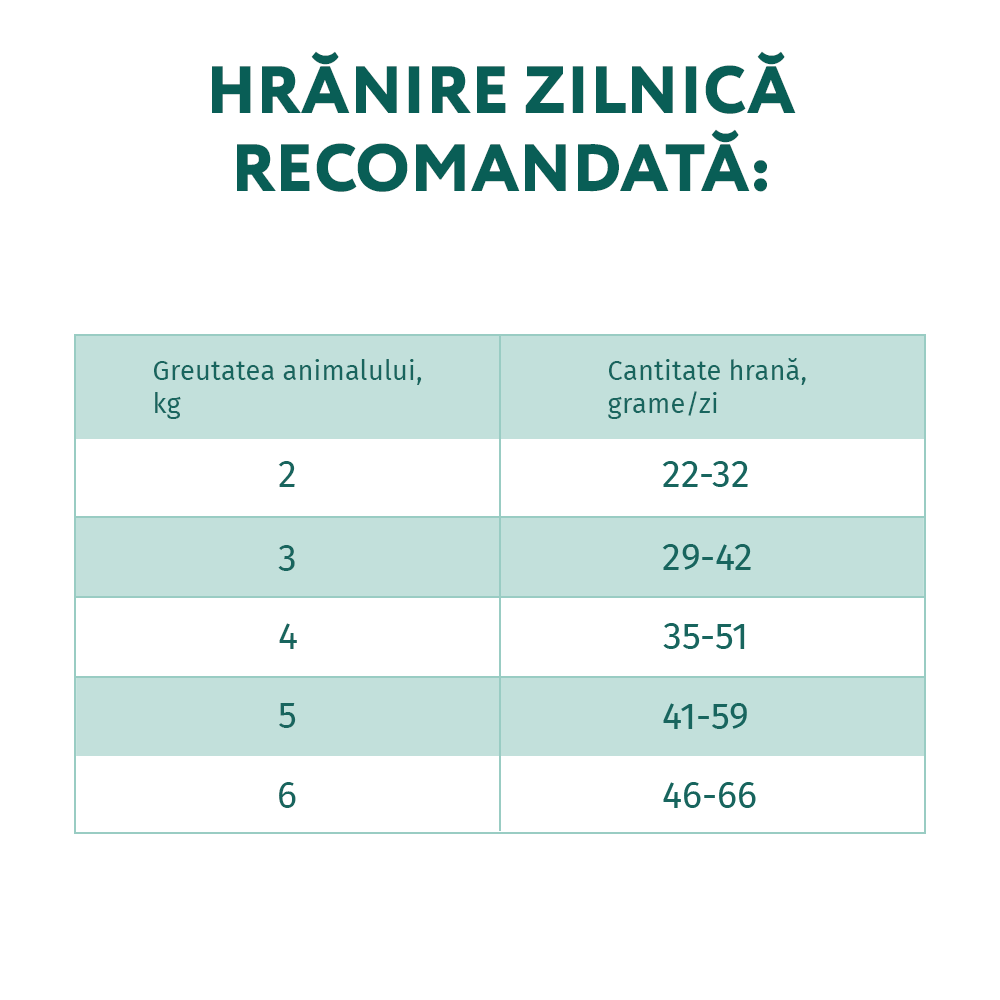 • Formula SUPER PREMIUM. Hrana se produce sub supravegherea medicilor veterinari care utilizeaza tehnologia companiei elvetiene Swiss Pet Nutrition Group.